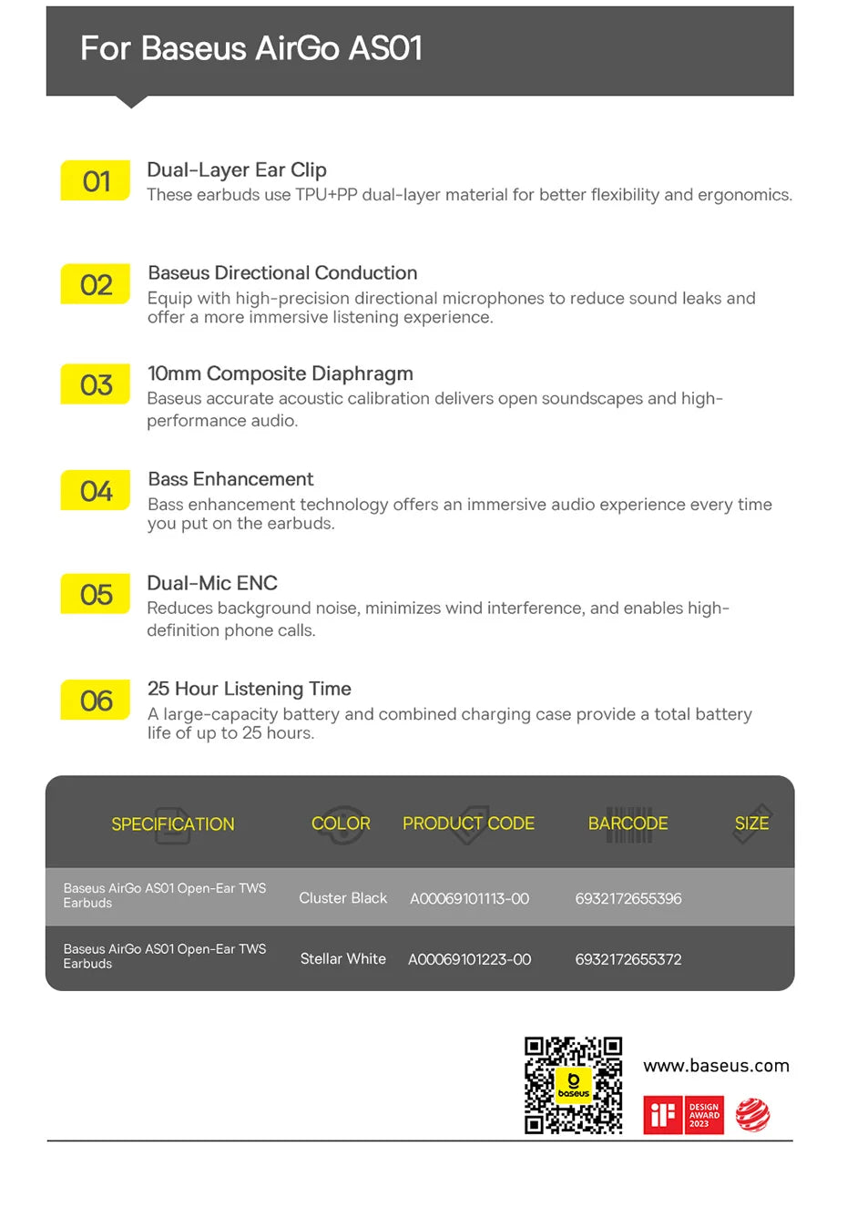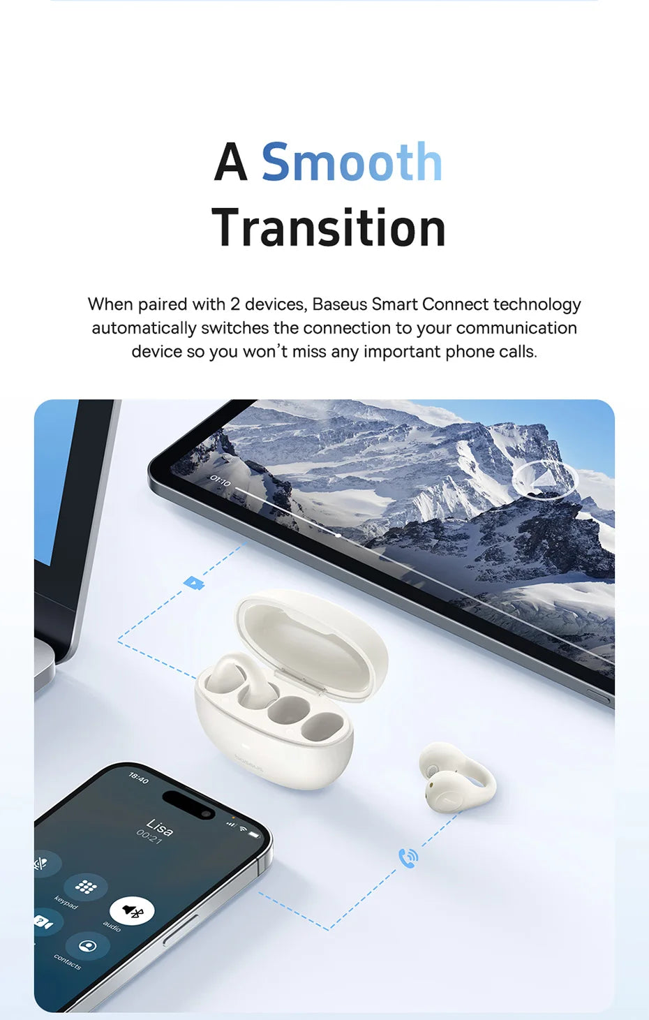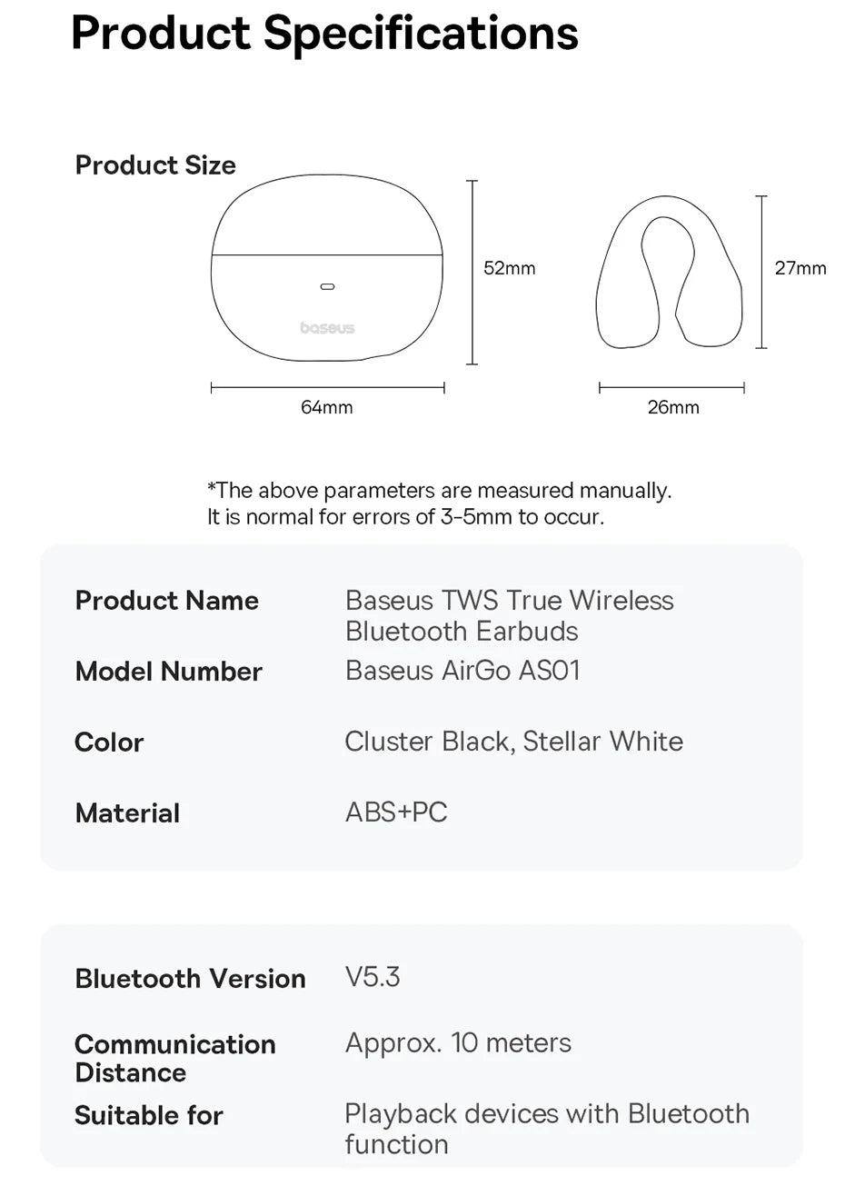 Enjoy secure, open-ear comfort and clear calls on the go with the Baseus AirGo AS01. Designed for active lifestyles, these lightweight ear clip earphones deliver stable Bluetooth 5.3 connectivity, crystal-clear calls, and long-lasting comfort.