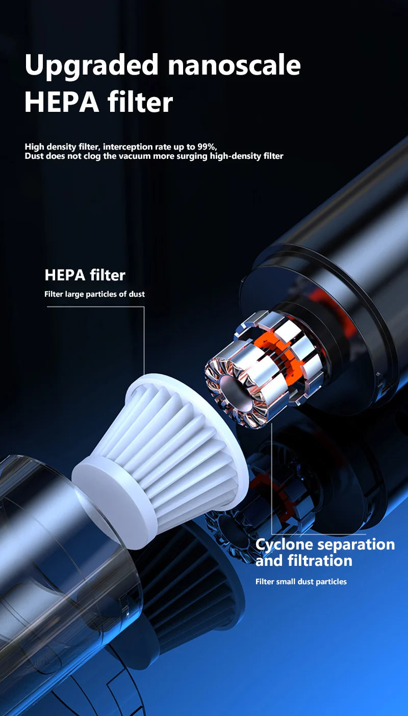 Washable HEPA Filter – Captures fine dust and allergens, improving air quality; easy to clean and reuse.